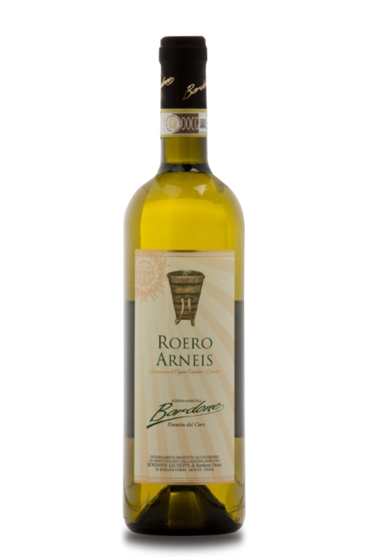 Roero Arneis fra Giuseppe Bordone har en strågul farve med grønne nuancer, mens dens duft er blød, blomsteragtig med hint af kamille og hvide frugter. Den har en tør og harmonisk smag med en behagelig syrlig undertone, der giver den friskhed og balance.